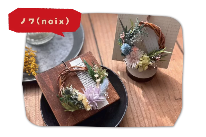 手のひらサイズのボードに手作りリースを添えて。自分だけの小さな花雑貨が作れるワークショップです。販売ではグリーンを主役にしたスワッグ等も並びます。
