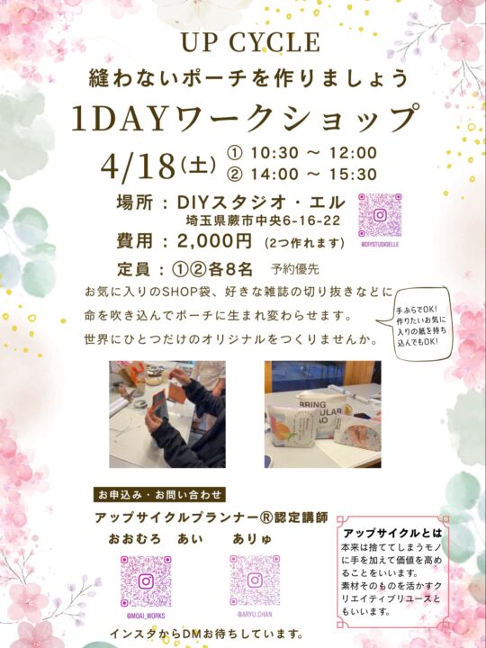 4月の特別な1DAYワークショップのお知らせです! 今回は、アップサイクルプランナー®認定講師のお二人をお招きして、お気に入りの紙を実用的なアイテムに生まれ変わらせる「縫わないポーチ」作りのワークショップを開催いたします✨