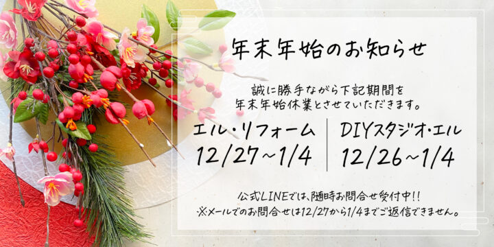 DIYスタジオ・エル休業期間: 2025年12月26日(金)〜2026年1月4日(日)